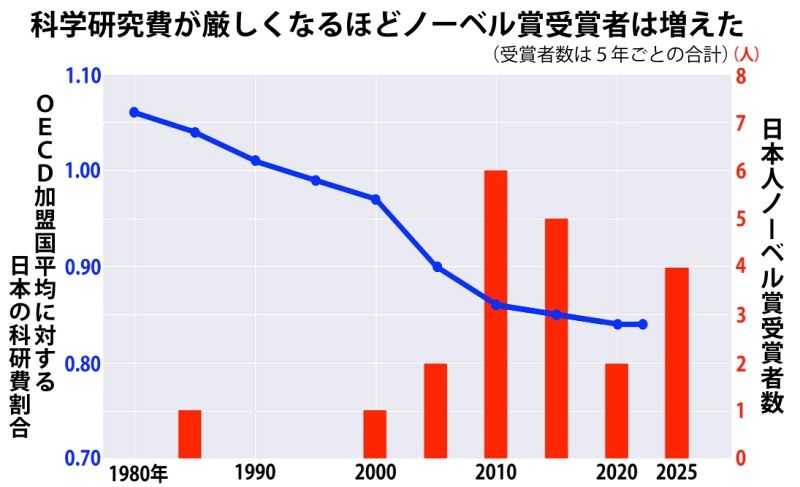 科学研究費が厳しくなるほどノーベル賞受賞者は増加